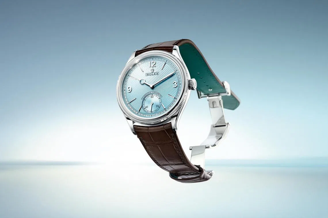 The Rolex Perpetual 1908 in platinum turns heads with its fluted bezel and a beautiful ice-blue “rice-grain” guilloché dial.
