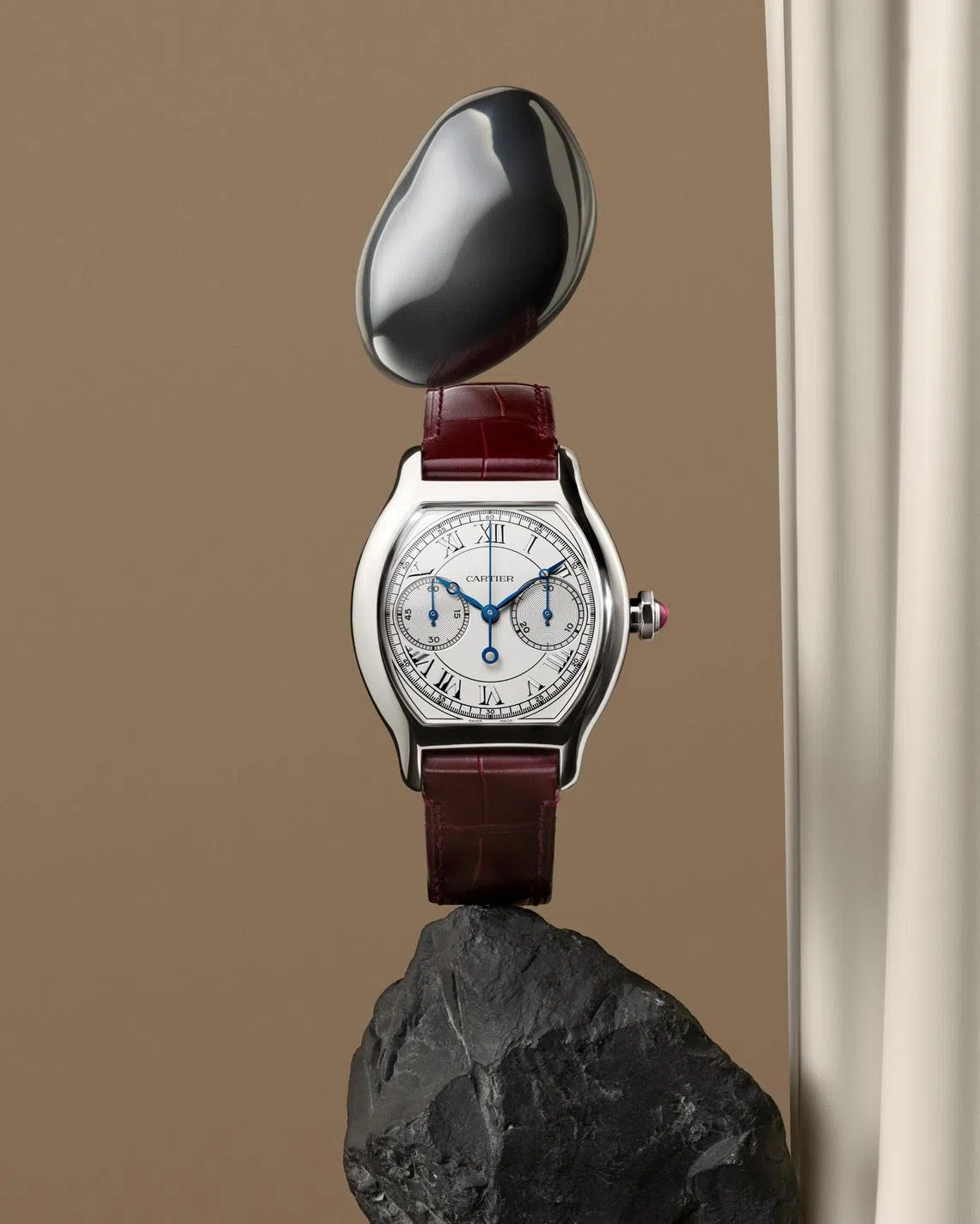 The new incarnation of the Cartier Tortue Monopusher Chronograph is available in either platinum or yellow gold, and sports a distinctively shaped 43.7mm by 34.8mm case, which is 10.2mm thick.