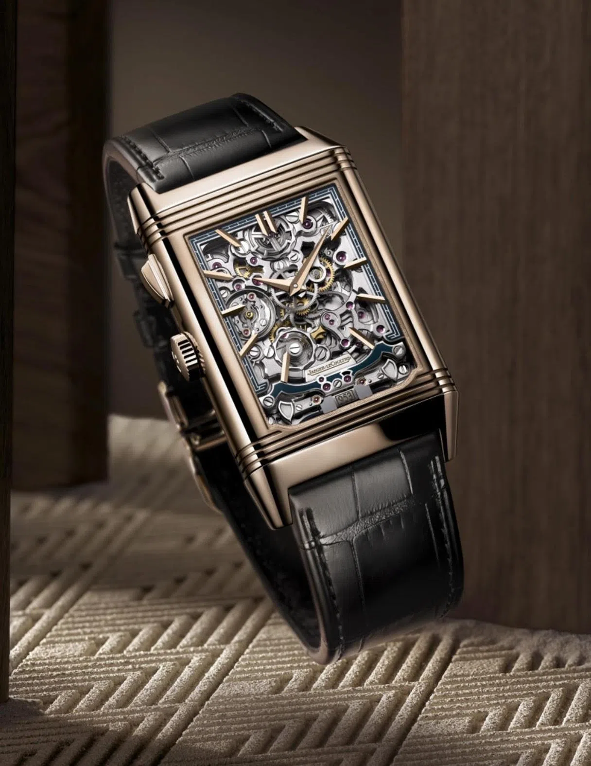 The reverse side of the Reverso Tribute Minute Repeater reveals an openworked view of the new Calibre 953, with cantilevered indices hovering over intricate mechanics.