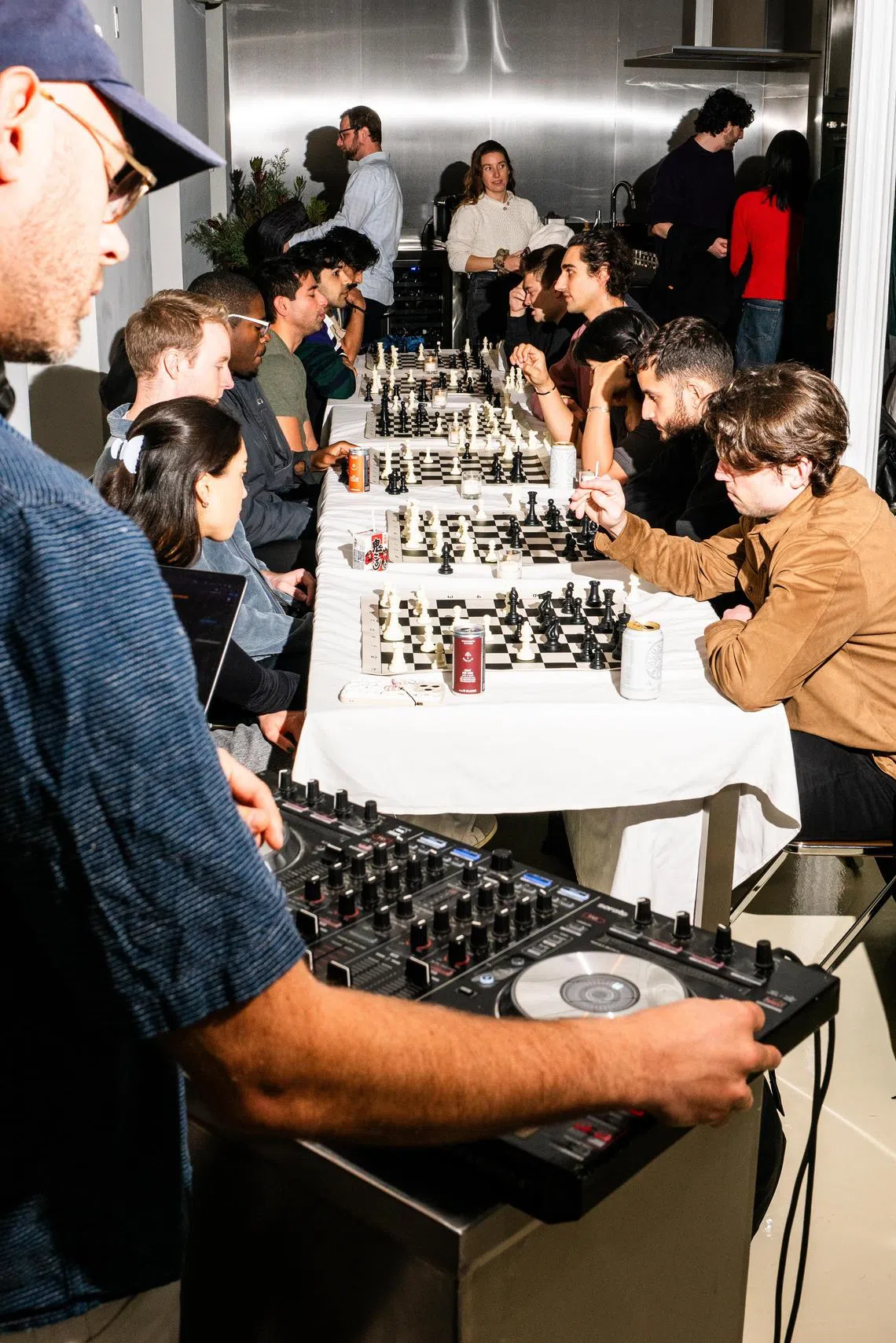A DJ plays at a meeting of the Pawn Chess Club in an apartment on Canal Street in Lower Manhattan on Dec 10.