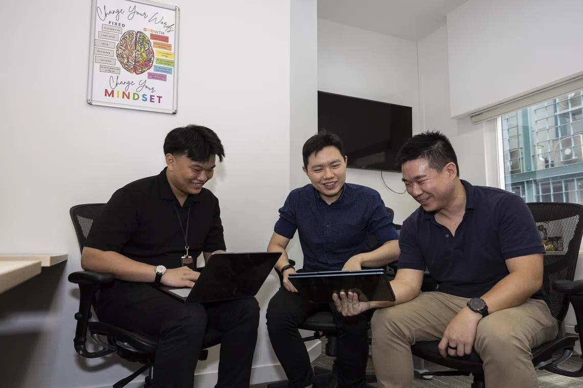 In 2025, the number of in-office days at start-up Singapore eCommerce Centre goes up from one to two. Its staff include co-founders Joel Fu (centre) and Eugene Sim (right), and marketing manager Teo Xuan Hao.
