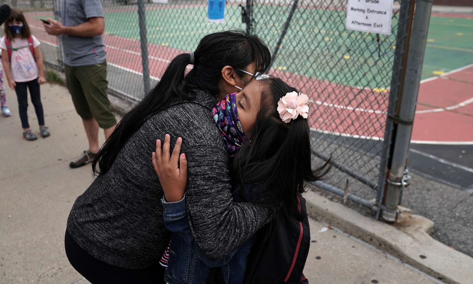A parent and child hugging before the first day of school in New York last month. During the coronavirus pandemic, the absence of everyday touch has become a source of stress.