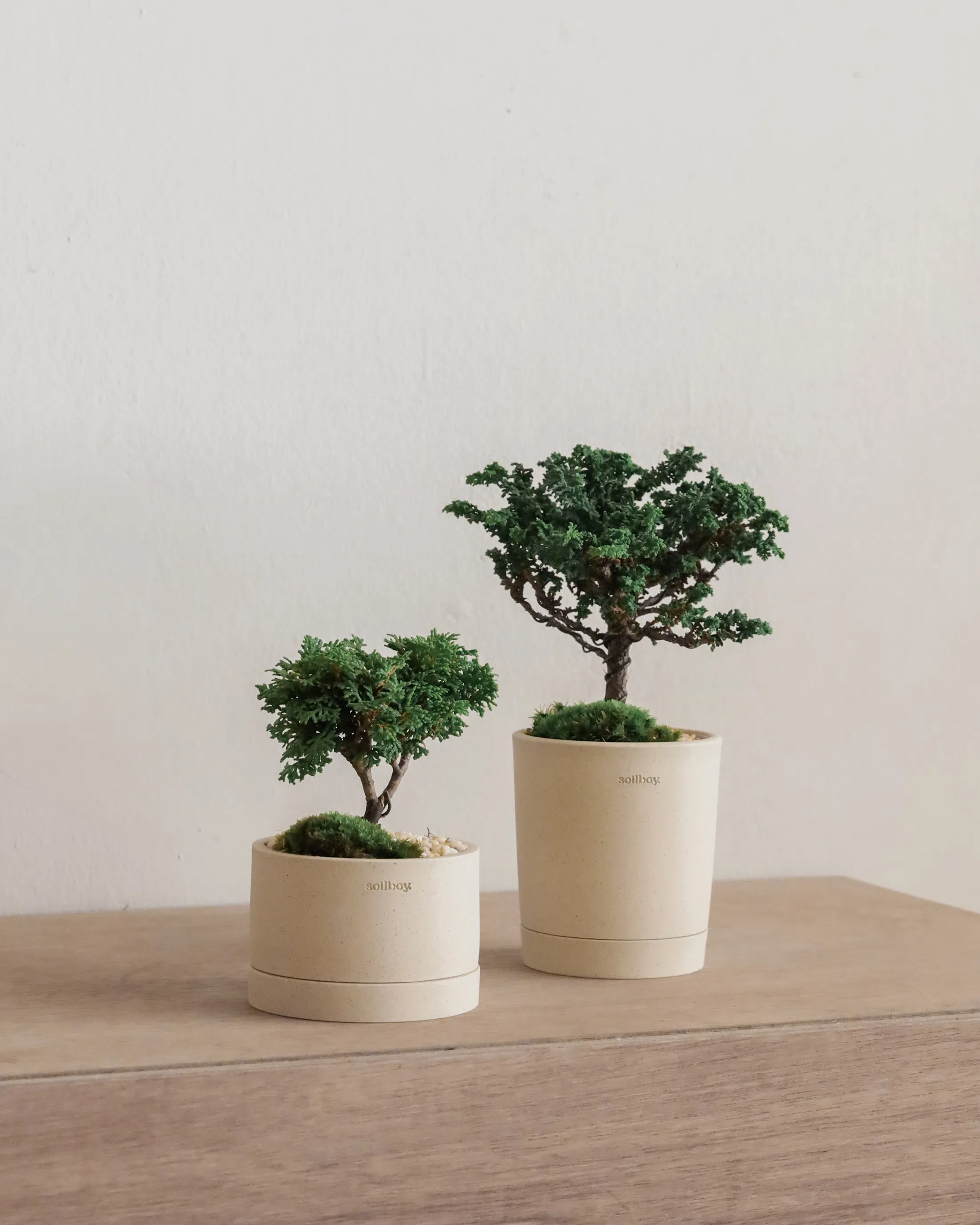 Sekka Hinoki Bonsai in Soilboy Flat Planter (left $228, right $298), available at Soilboy in Sin Ming Road.