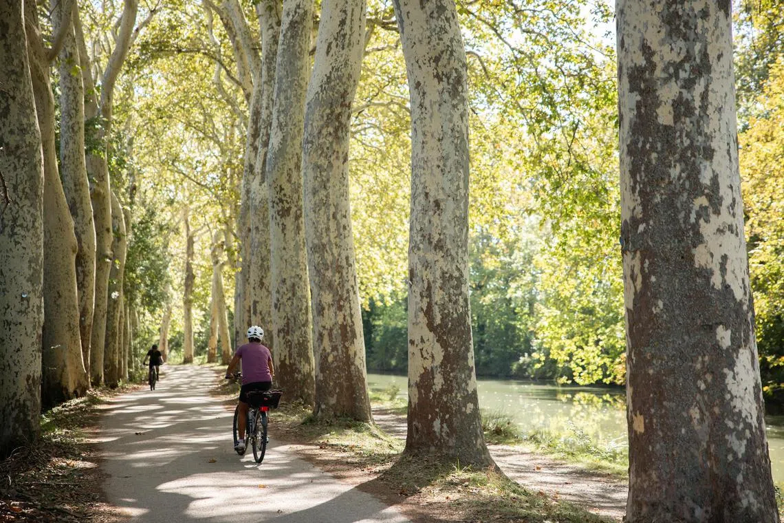 The canal towpath is shaded by plane trees near Toulouse, France.