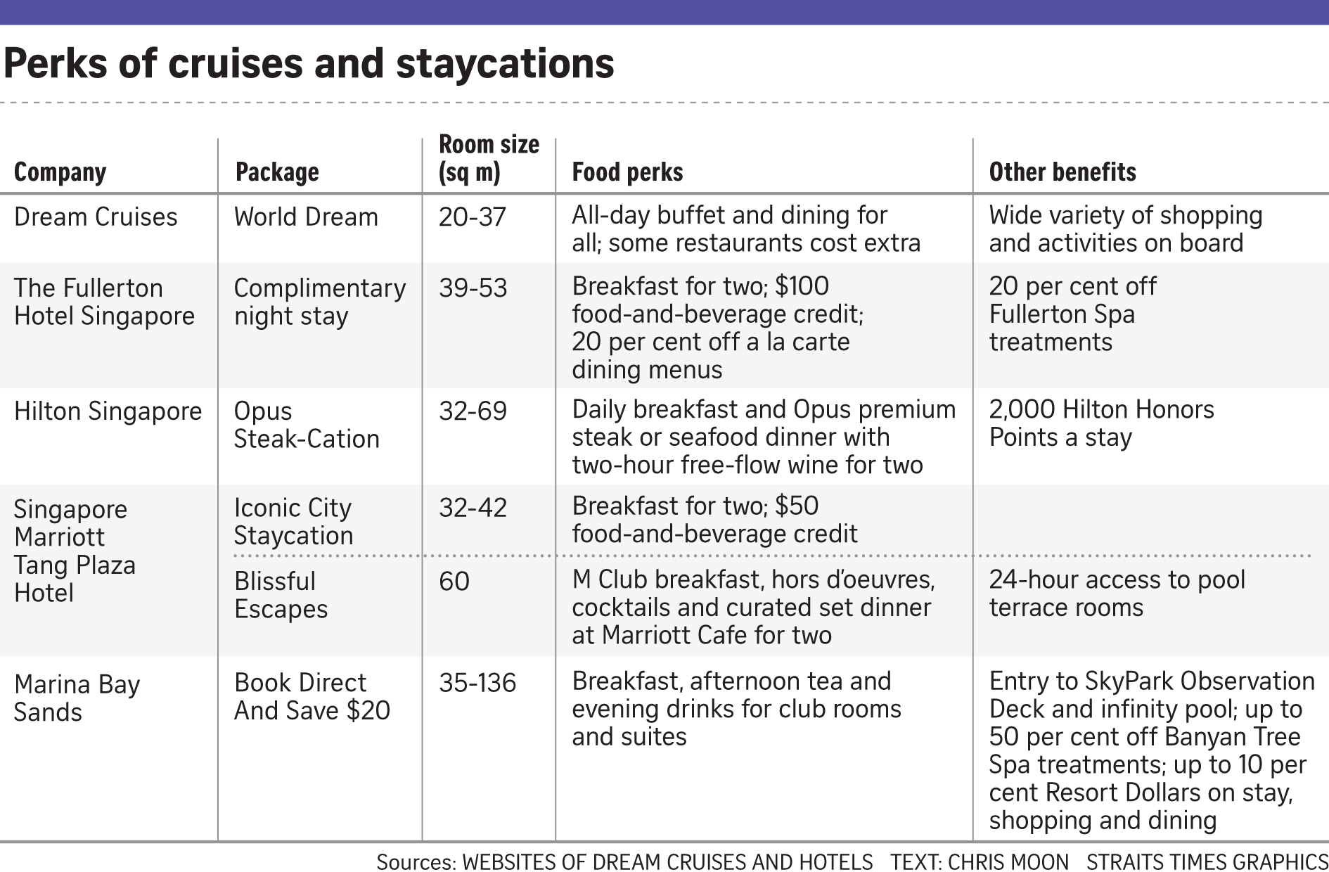 A look at the perks included in each package showed that cruises to nowhere offered decent all-round value for families needing a variety of activities, while staycations seemed best for couples seeking to indulge in fine dining and in-suite comforts (see table on "Perks of cruises and staycations").