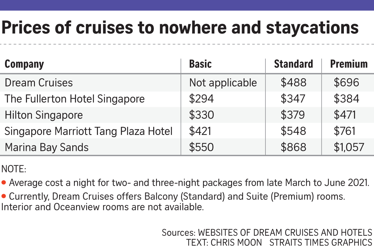 The average cost of a basic staycation package - at $396 a night - was significantly lower than the average cost of a ticket with Dream Cruises for a cruise to nowhere, which was $488 a night over two to three nights (see table on "Prices of cruises to nowhere and staycations").