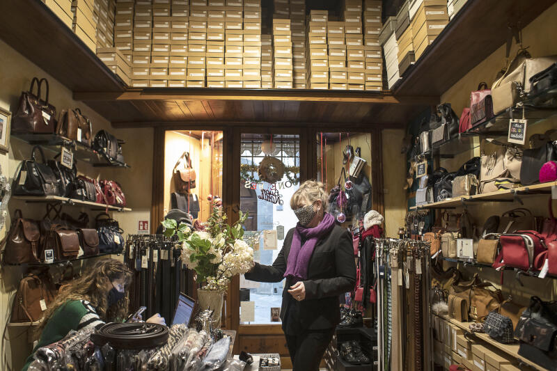 Claire Cappelletti and her daughter (left) in their leather shop, in Castellina, Italy, on Dec 17, 2020.