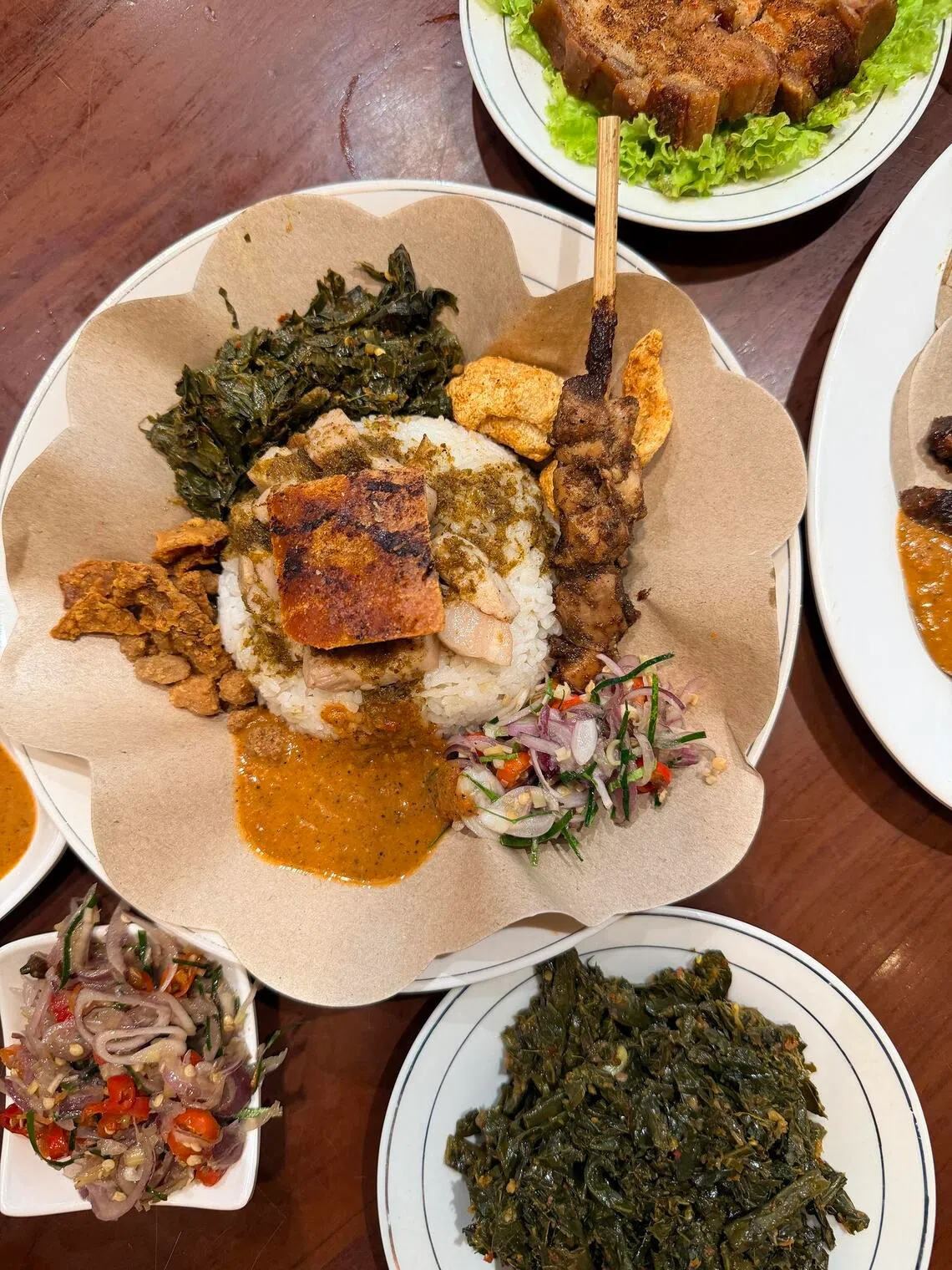 Order the nasi samcan guling komplit (58,000 rupiah) for an assortment of the eatery’s best – rice served with chicken satay, daun ubi (cassava leaves), pork crackling and roast meat, topped with a single precious square of roast pig skin, perfectly crisp.