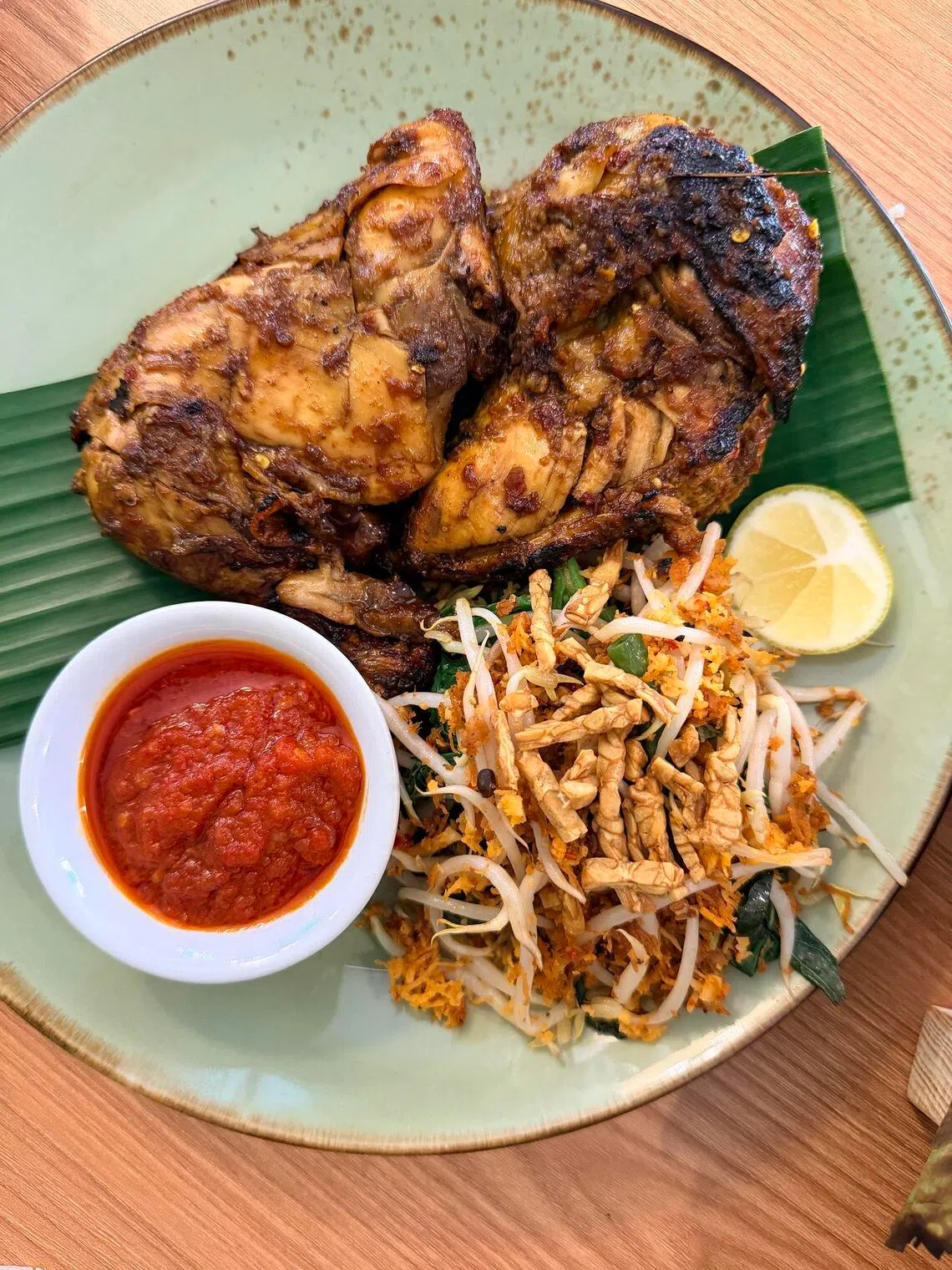 Ayam bakar is accompanied by urap, a salad topped with spiced grated coconut.