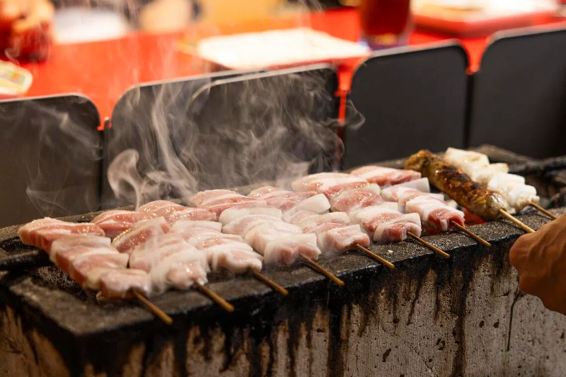 The menu is straightforward and we savour an array of skewers – priced at about 150 yen a stick. They include chicken breast, chicken meatball, pork and juicy shiitake mushrooms – all masterfully grilled over charcoal.