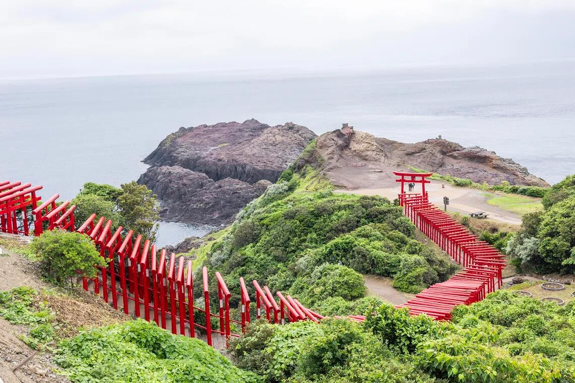 First, the striking Motonosumi Shrine features 123 red torii gates going uphill.