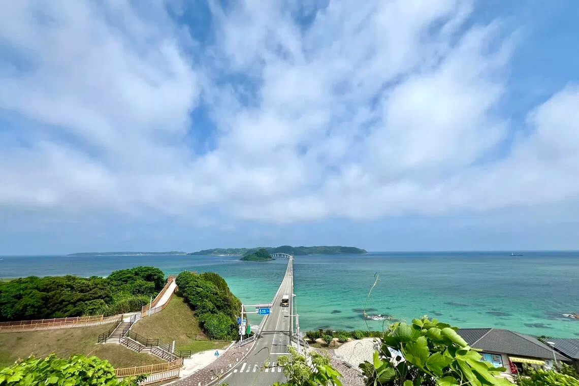 The 1,780m-long Tsunoshima Bridge stretches across the shimmering cobalt blue sea.