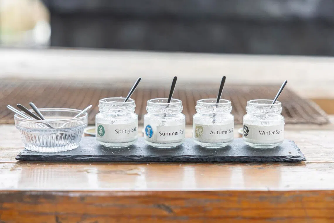 The salt – “made by nature” is the tagline on the door – is said to have a mineral balance close to that of the ocean, due to a traditional and laborious method called tenchi gaeshi.