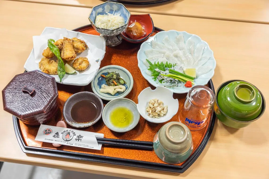 In its 3,500 yen (S$30) set, I get deep-fried mafugu (a type of purple pufferfish) karaage, thinly sliced torafugu (tiger pufferfish) sashimi with strips of its gelatinous skin, minced torafugu siew mai and torafugu confit, where bits of the fish are simply marinated in salt, sesame seeds and sunflower oil.