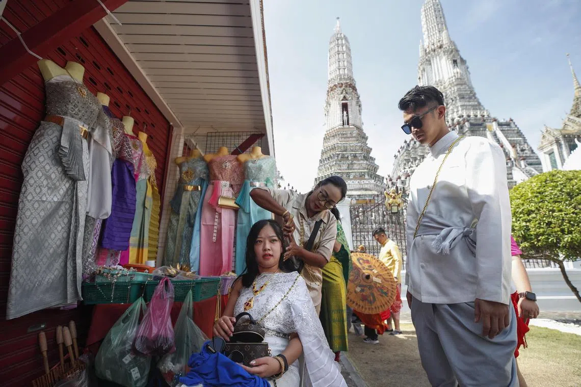 A Thai clothing rental vendor assists Chinese tourists to don Thai traditional costumes at the Temple of Dawn in Bangkok, on Jan 23.