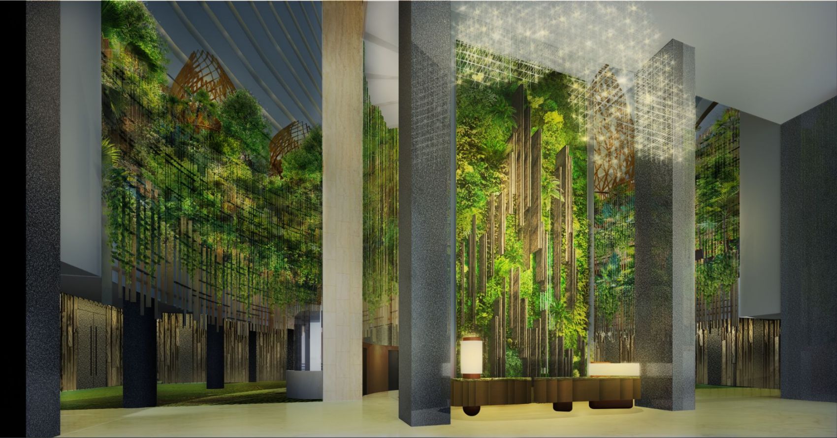 Be greeted by a stunning 13m wall of lush greenery, flanked by raised planters, creating a panoramic 180-degree view of a forest.