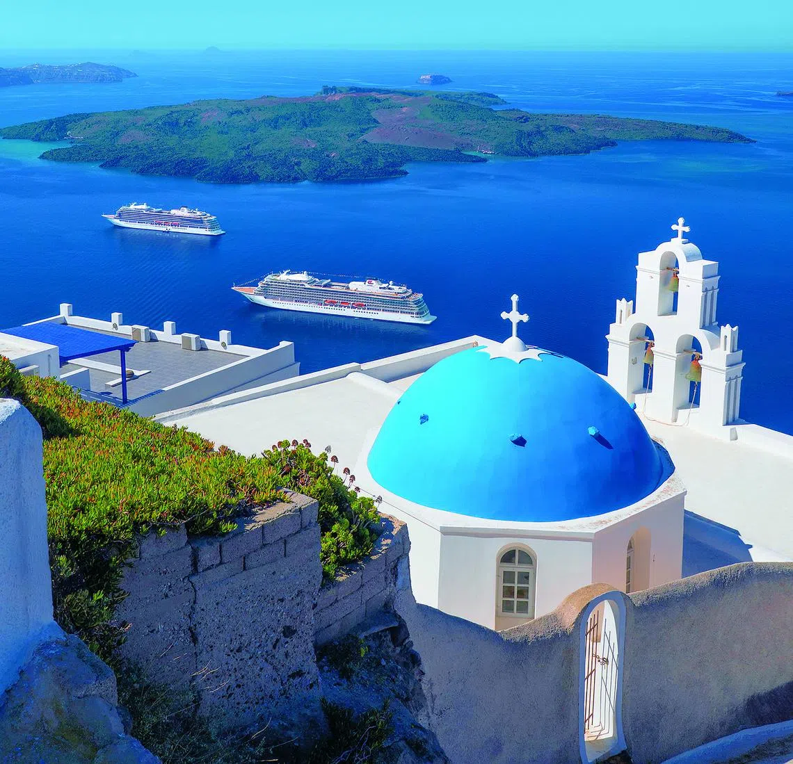 Two Viking cruise ships off the coast of the island of Santorini, Greece. Overtourism and summer heat have increased the allure of off-season travel in Europe.