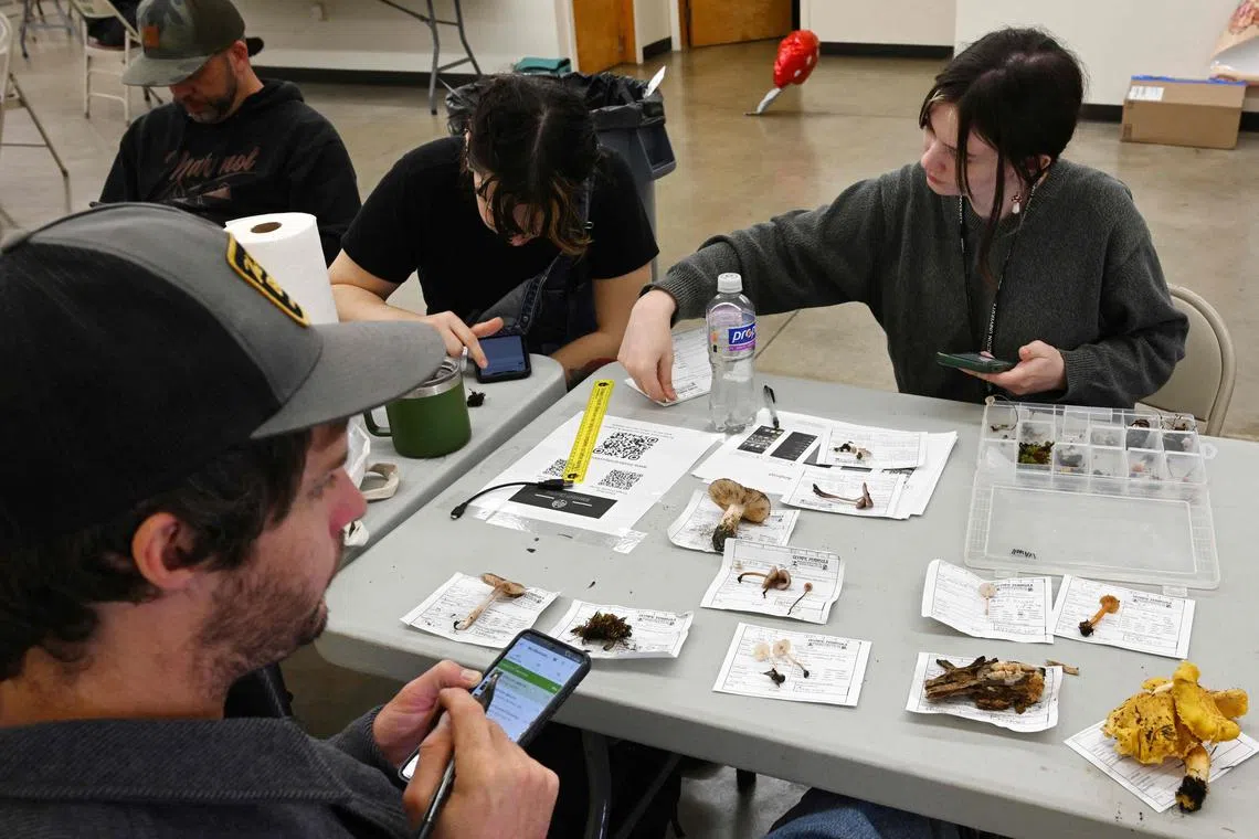 After collecting mushrooms for a survey, participants record details about the morphology and growing environment of each before sending the samples to aid in identifying the fungi in Port Angeles, Washington.