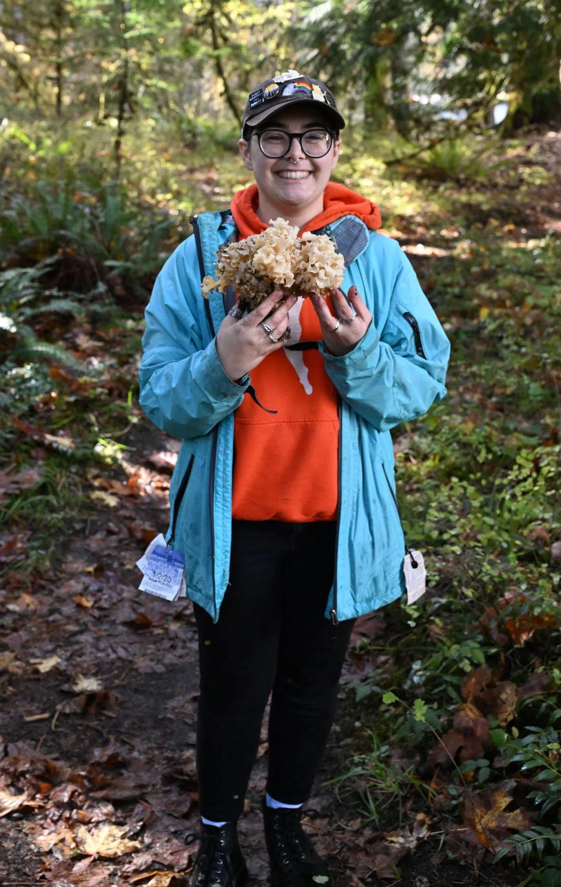 Ms Liv Filialuna holds up an edible cauliflower mushroom found during a mushroom biodiversity survey near Port Angeles, Washington.