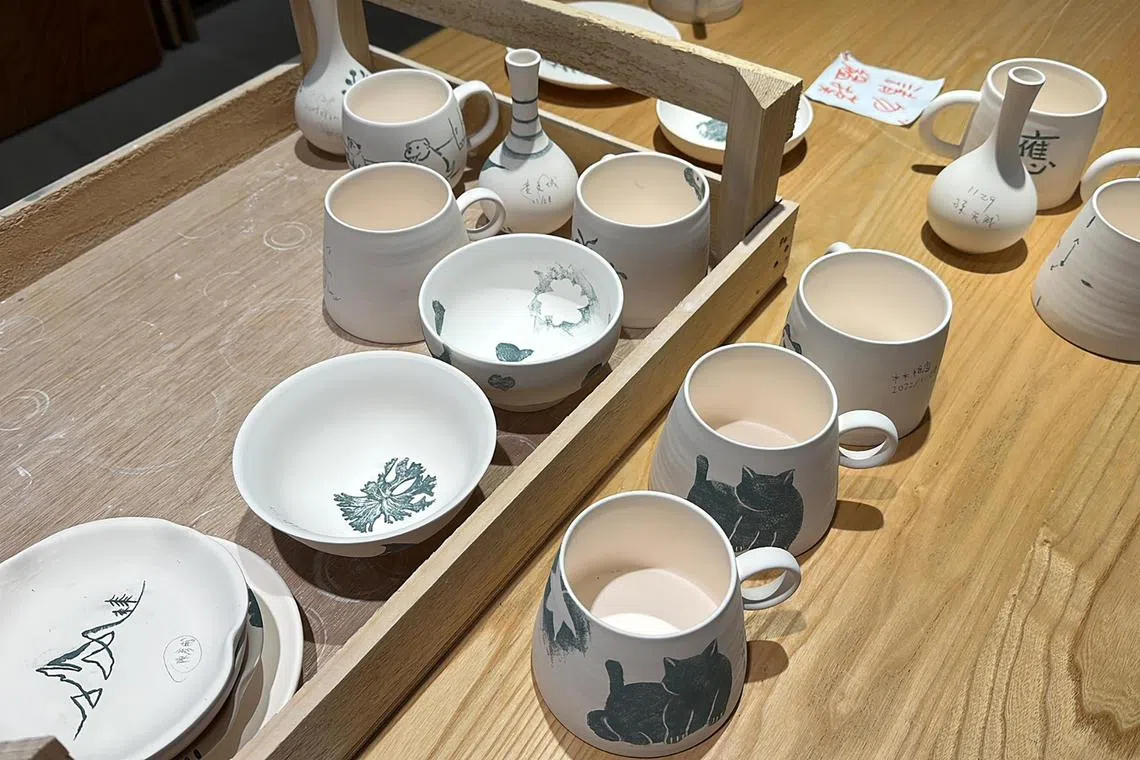 Ceramic items painted by visitors are ready for firing at Sanshing Four Seasons Blue And White Pottery.