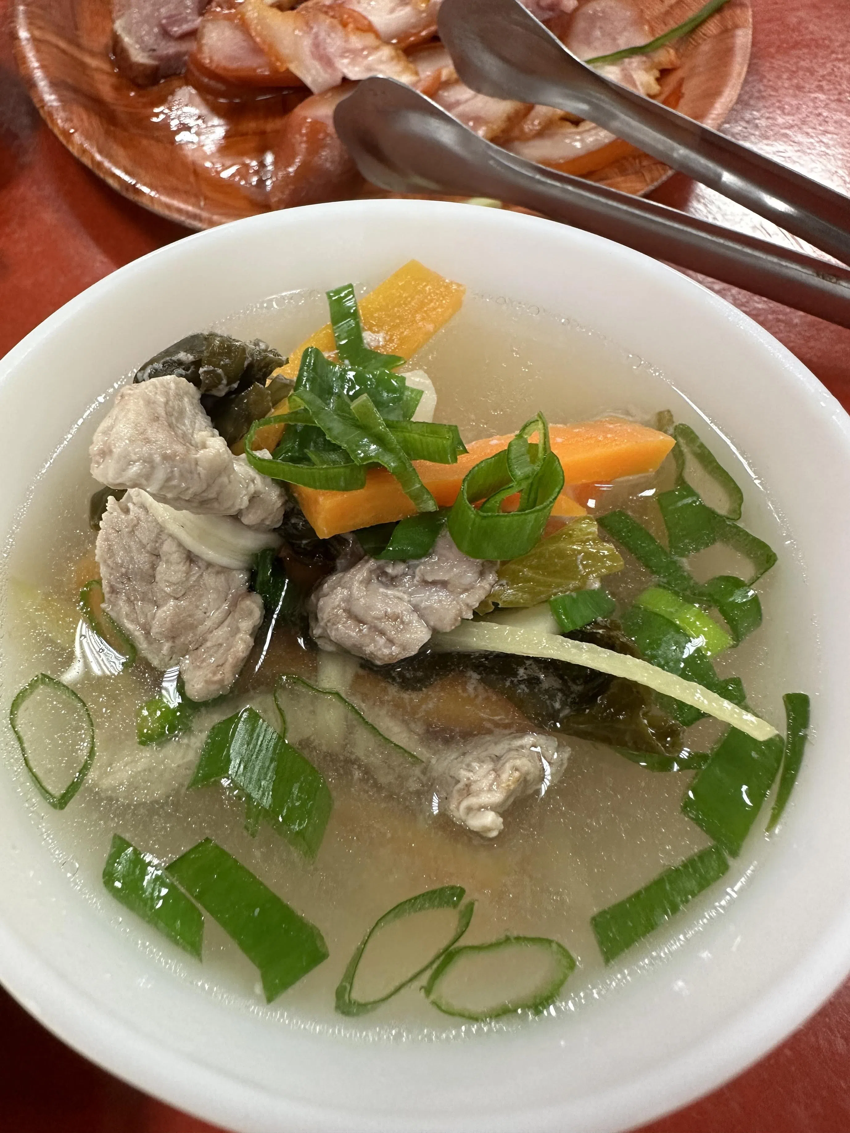 The highlight is a regional favourite: A simple soup made with little parcels of pork, carrot and salted mustard greens tied with dried gourd and layered with clams and generous piles of shredded ginger.