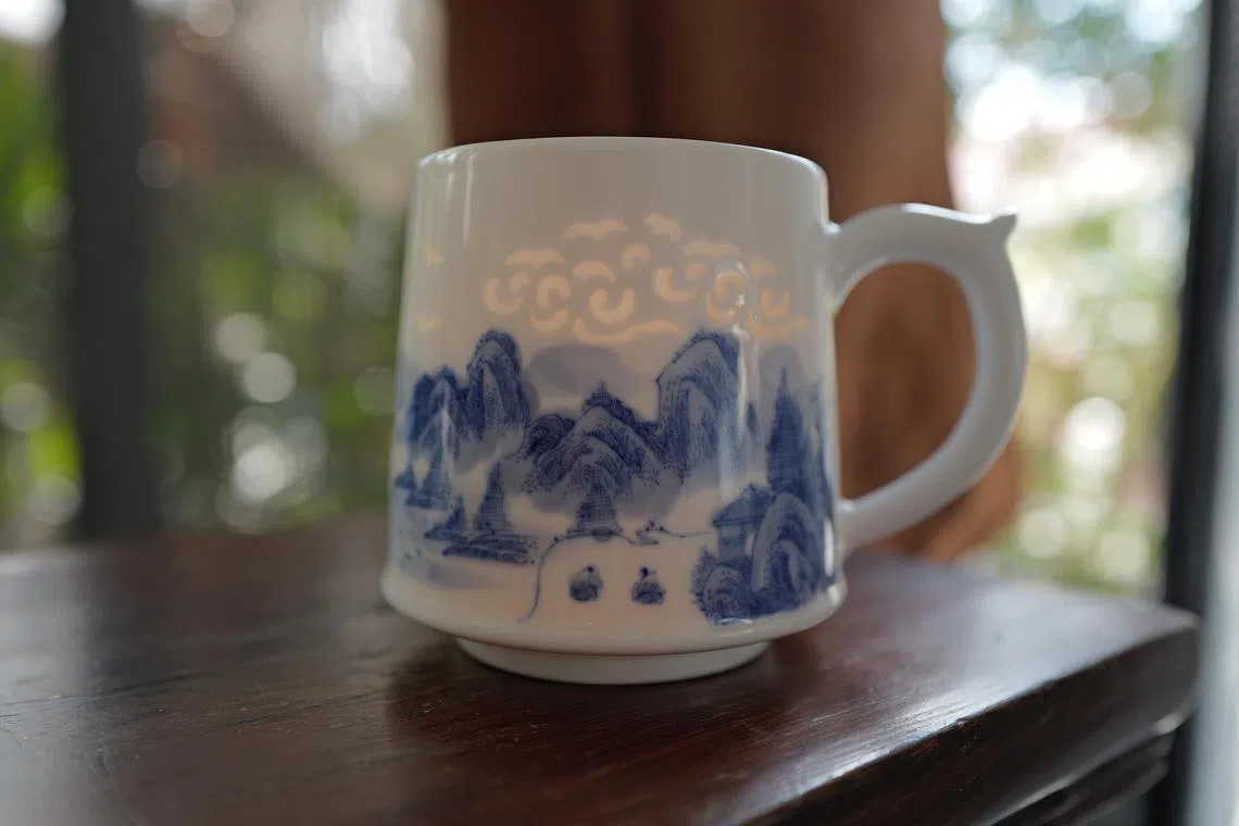 The patterns in linglong porcelain emerge when viewed against the light.