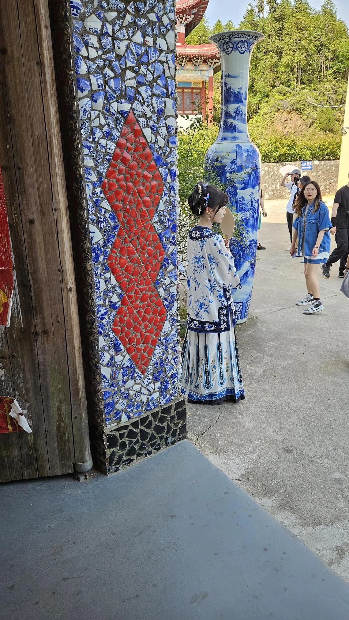 Visitors dressed in blue and white hanfu to match the decor.
