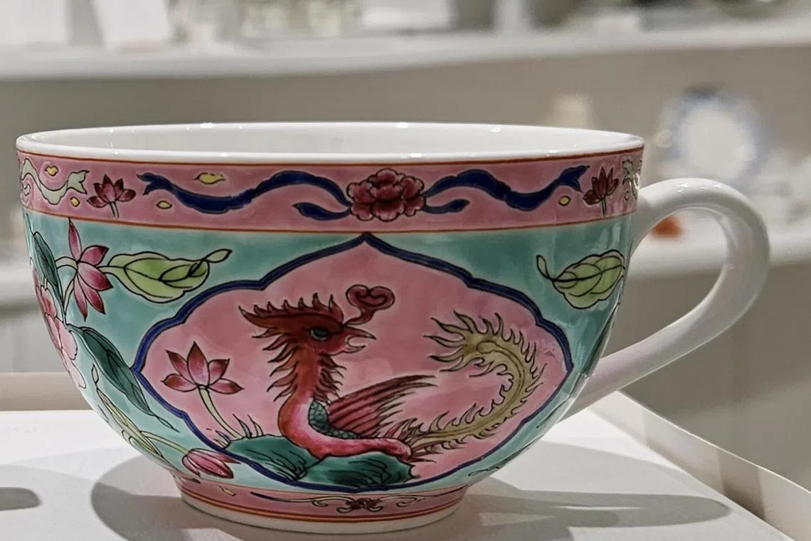 The famille rose porcelain in Singapore was made specially for the wealthy Straits-born Chinese community. Straits Chinese or Nonya porcelain is characterised by exuberant colours, and often features phoenix and tree peony motifs.