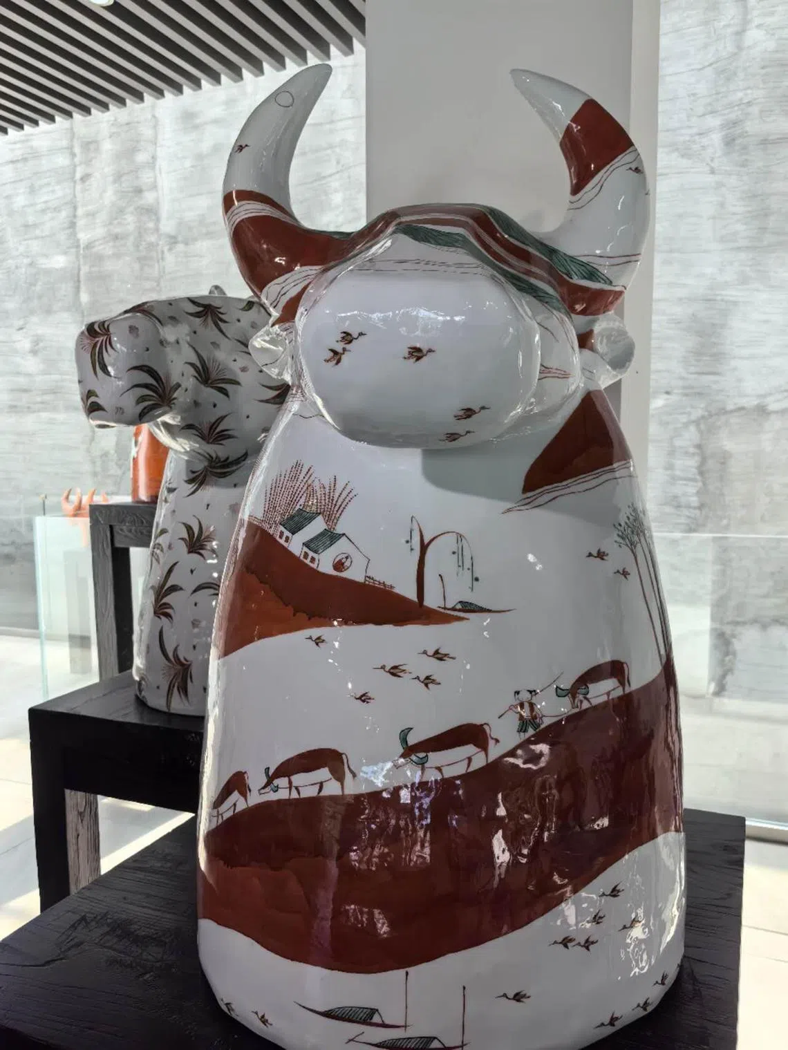 Some of the ox sculptures are made from a special clay fired to a beautiful rustic orange hue with light gold streaks. The creations have a distinct Chinese aesthetic.