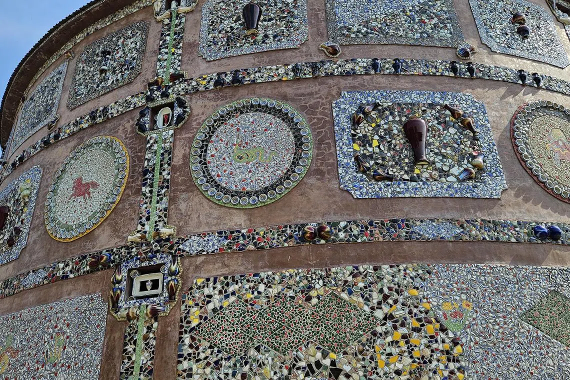 The “palace” features three-storey rotundas covered from floor to ceiling in porcelain shards. More than 60,000 colourful ceramic wares, including a pair of precious Ming vases, decorate the windows, doors, ceilings and walls.