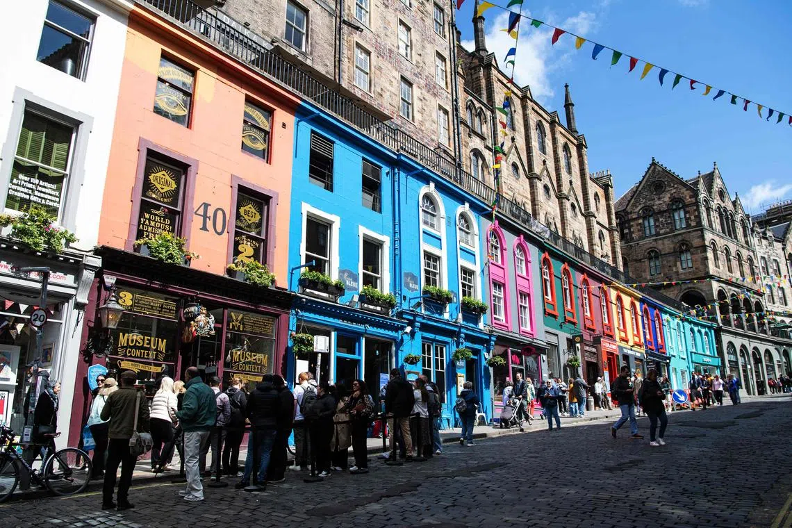 Tourists waiting to enter a Harry Potter merchandise shop in Victoria Street in Edinburgh.