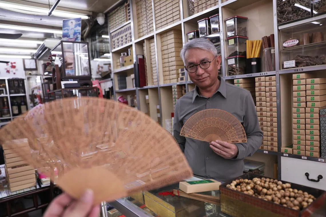 Mr Lowell Lo, second-generation owner of Cheung Shing Fans Factory, sells sandalwood fans and incense in Shanghai Street in West Kowloon.
