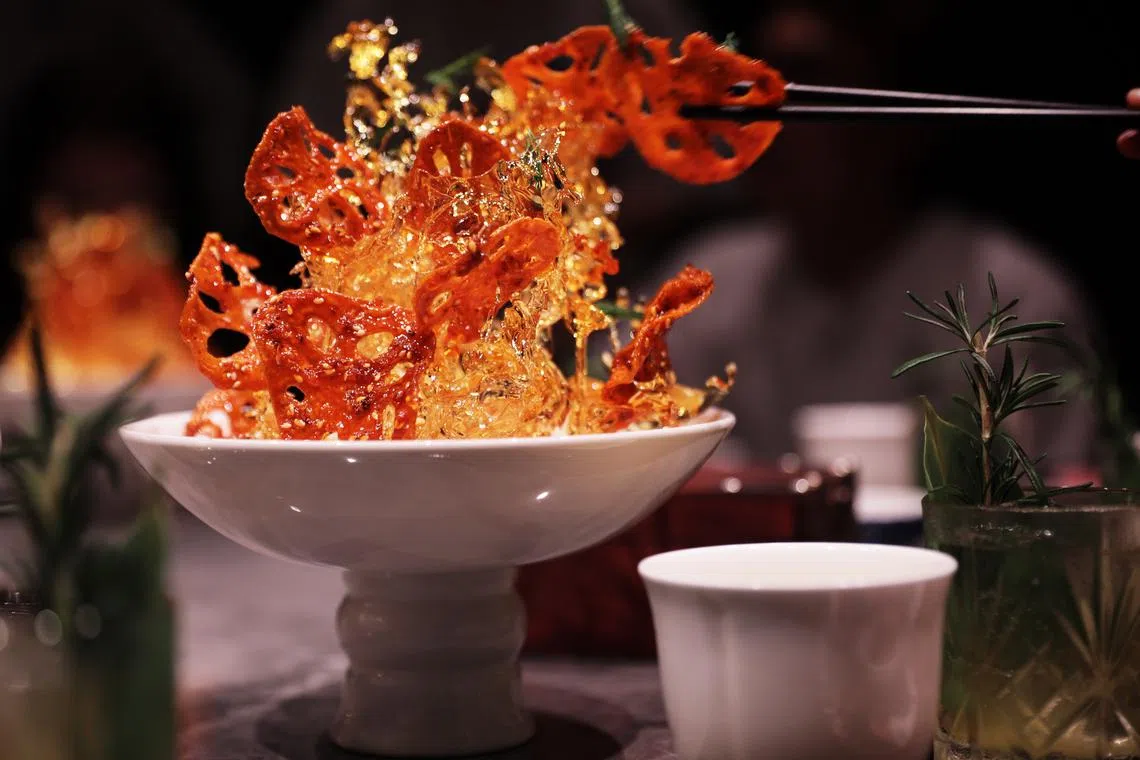 Candied, crispy lotus root, a vegetarian rendition of sweet-and-spicy Sichuan thin-sliced roast beef, served at Chineselogy.