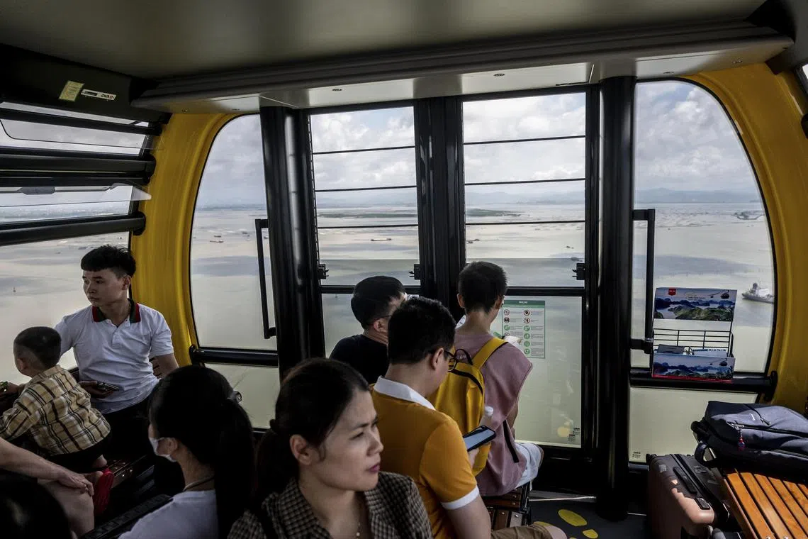 Tourists in a Cat Hai-Phu Long cable car at the planned Sun World Cat Ba complex in Hai Phong.
