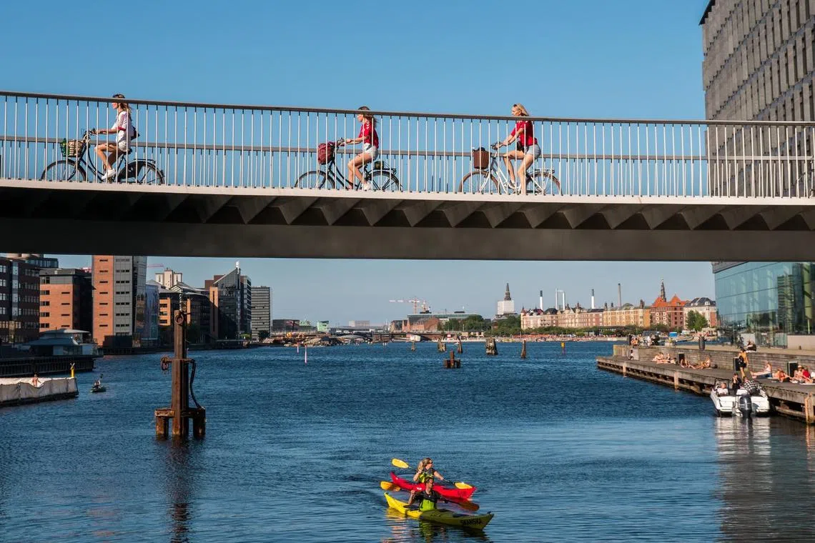Copenhagen’s Cykelslangen is a bicycle bridge suspended over the harbour, offering cyclists a different view of the city.