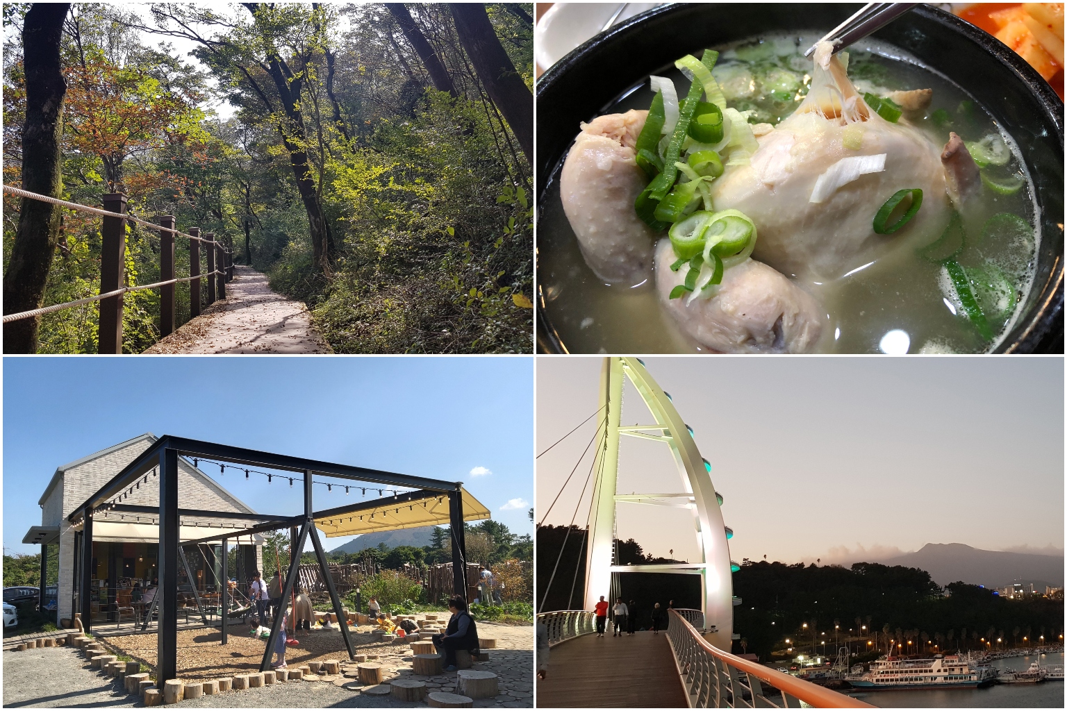 (Clockwise from top left) Jeolmul Forest Park, Go Geup Samgyetang, Saeyeon Bridge and Playground Nol Nol in Jeju Island.