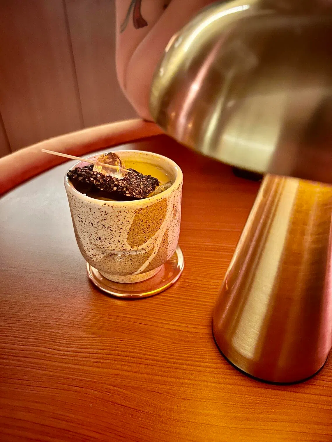 My Ash Grey (185,000 rupiah) is a flip cocktail – a style that uses an egg to add richness to the drink – and combines components such as black sesame and rice liqueur with peanut butter Scotch. Atop, a nutty black sesame cracker and a touch of sweetness from mango jelly.