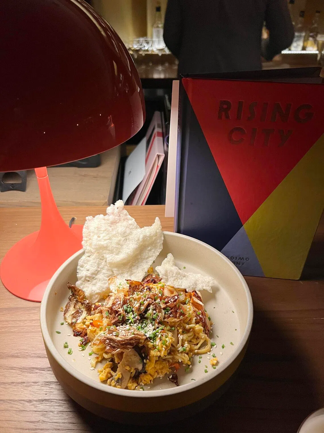 Indomie at Cosmo Pony comes studded with king oyster and shimeji mushrooms, bits of fried egg, sesame seeds and spring onions.