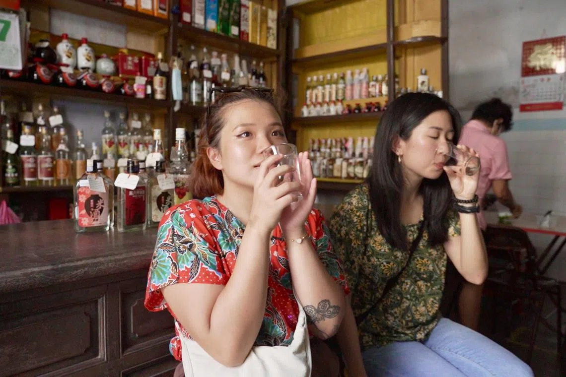 Content creator Nicole Chen (left) and travel correspondent Clara Lock sample rose-flavoured rice wine at Sin Hiap Hin.