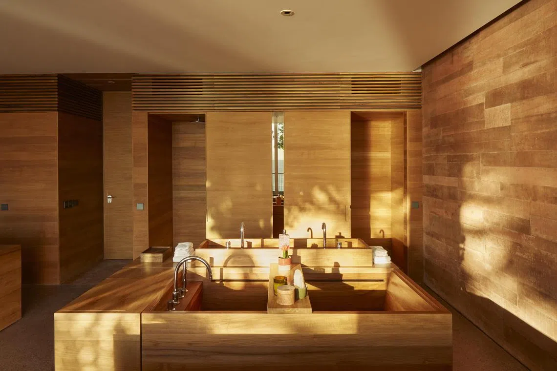 Apart from the pops of colour from soft furnishings, such as ikat tapestries by Bali-based natural-dye studio Tarum, the room is clad almost entirely in honey hues, with built-in furniture made from recycled wood – including the large Japanese-style bathtub.