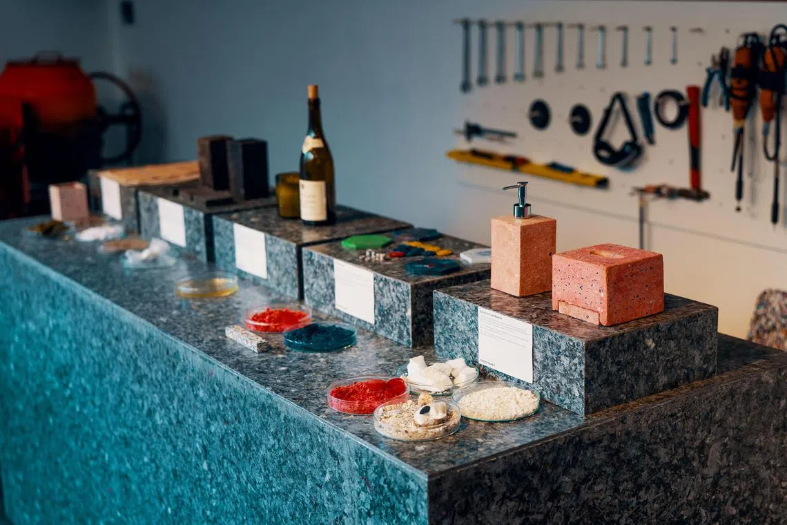 The resulting goopy mixture is then poured into moulds for making tissue boxes and soap dispensers. Reconstituted, colour-speckled plastic can also be laser-cut into components for making chairs and other furniture around the resort.
