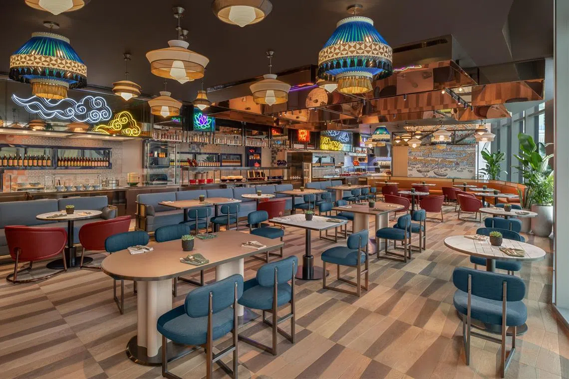 Breakfast is served at Hawker Hawker, its all-day dining restaurant inspired by the local street food and marketplace culture that is seen in the eclectic and colourful lights and neon designs above the food stations.