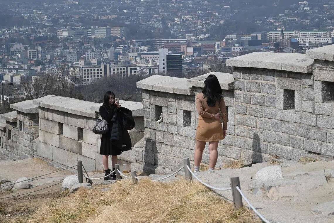 Visitors take pictures along the fortress wall at Naksan Park - featured in a scene from KPop Demon Hunters - in Seoul on March 17, 2026.