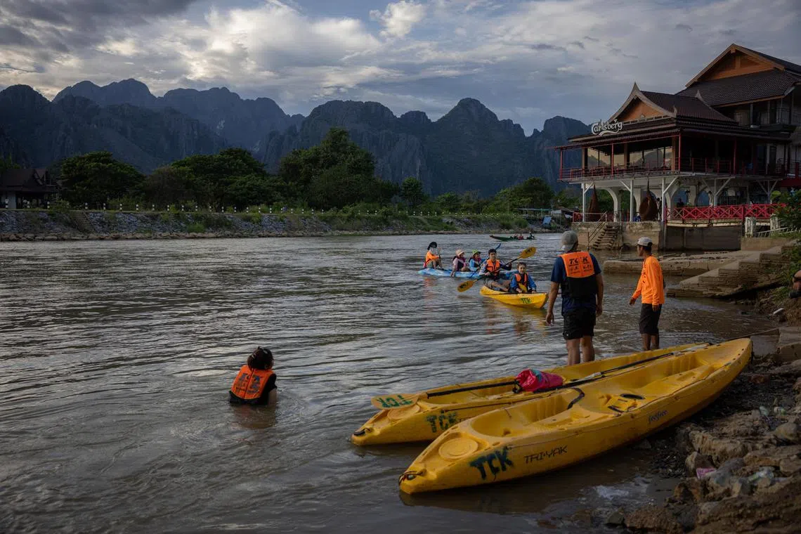 Tourists kayak down Nam Song River in Vang Vieng, Laos, in October 2024.