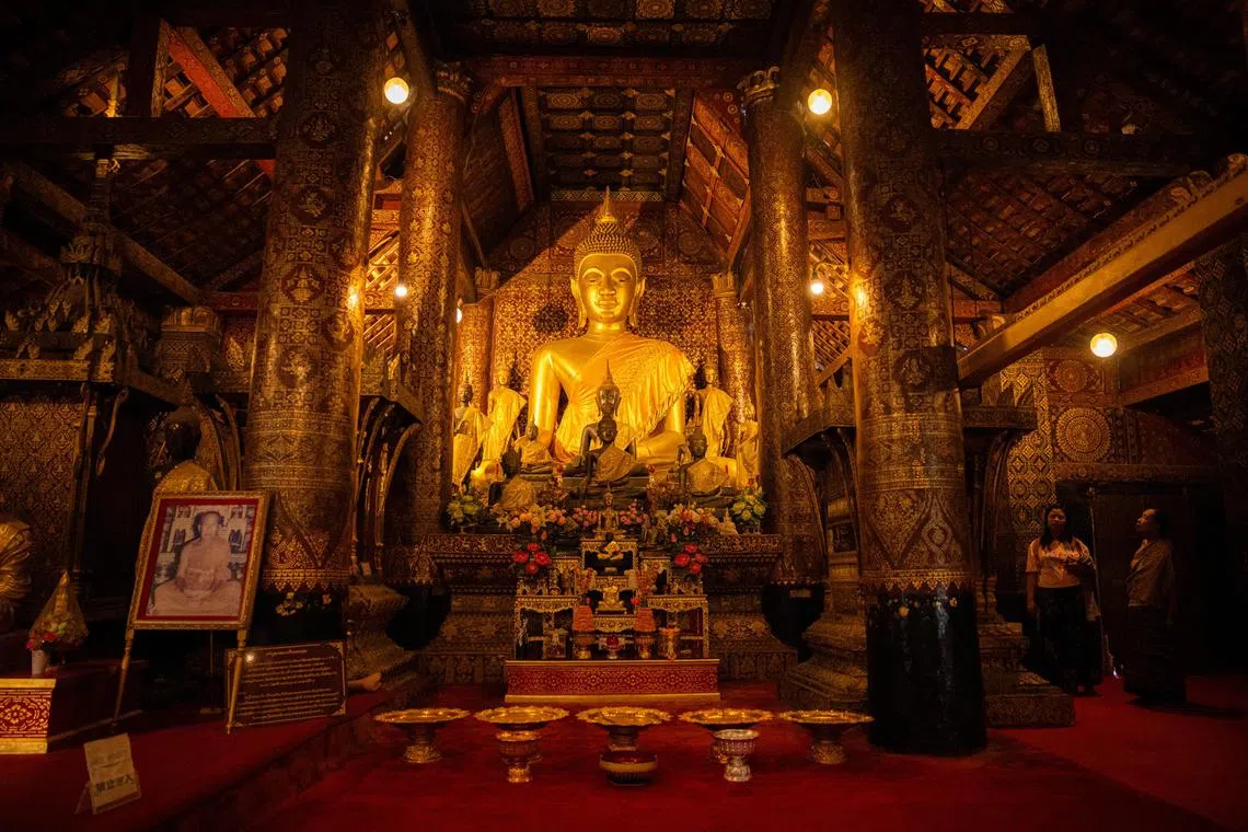 The Buddha statue at Wat Xiengthong Temple, a significant symbol in Laos spirituality and art, in Luang Prabang, Laos.