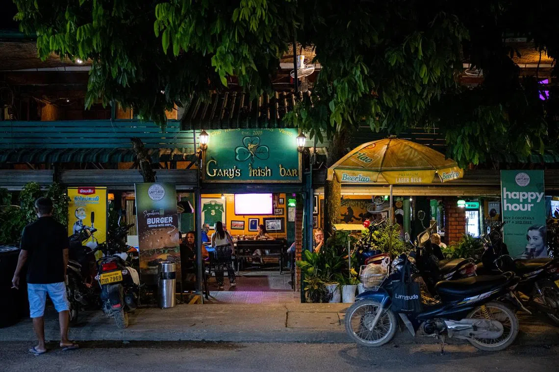The entrance to Gary’s Irish Bar, an Irish-style pub, in Vang Vieng, Laos, in October 2024.