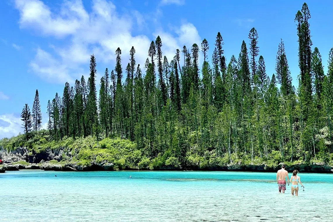 At low tide, the sea parts to reveal a sandy canyon flanked by towering trees at the Isle of Pines, which is a short ferry or plane ride away from Noumea.