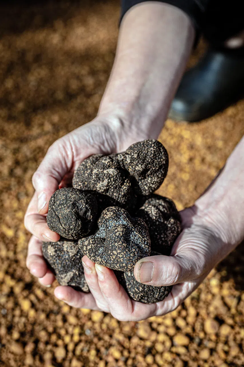 Before planting, the trees have their roots inoculated – they are dipped in a special fungi solution. These fungi spread tendrils of mycelium throughout the soil, helping their host tree roots to unlock micronutrients. The fruiting body of the fungi, the black Perigord truffle, is the most prized cultivated truffle in the world.