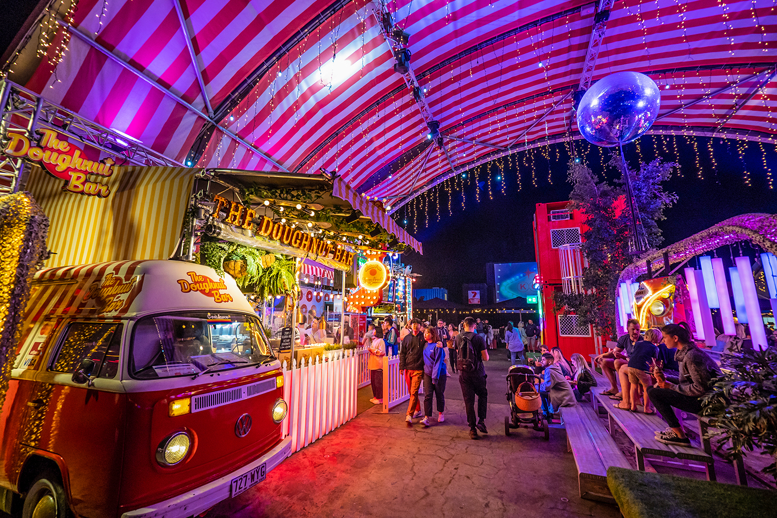 It’s elevated street food — sure you’ll find burgers, pizzas and dumplings but you’ll also get fresh oysters, beef brisket Bourguignon, cheese fondue, okonomiyaki (Japanese savoury pancake), paella and gozleme (crispy Turkish flatbreads with tasty filling). Desserts also get an inventive treatment, with ice cream tacos, doughnut fries, towering funnel cakes and pastel clouds of fairy floss as big as your head.