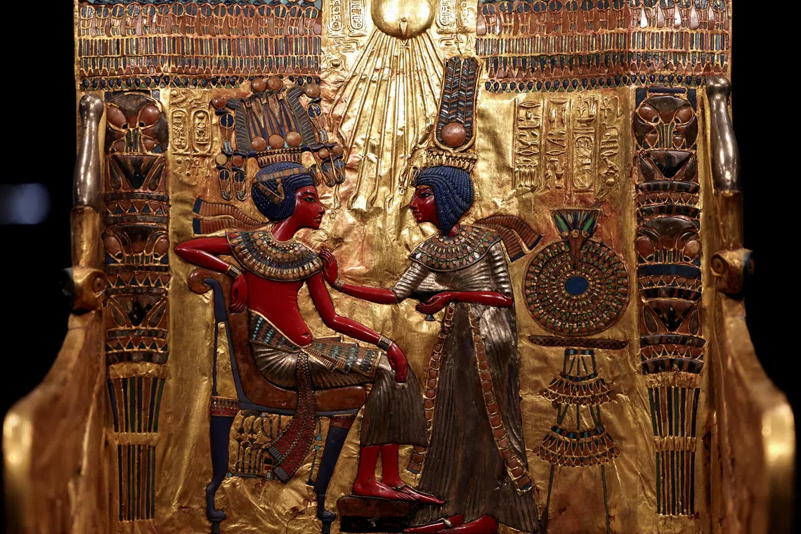 A detailed view of the golden throne of ancient Egyptian king Tutankhamun.